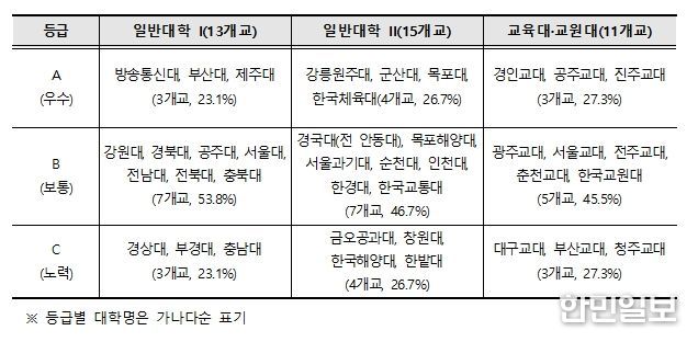 국립대(37개교) 및 국립대법인(2개교) 총 39개교를 전임교원 수에 따라 일반대 Ⅰ(13개교), 일반대 Ⅱ(15개교), 교육대·교원대(11개교)로 분류하여 점검을 실시했으며, 주요 결과는 다음과 같다.