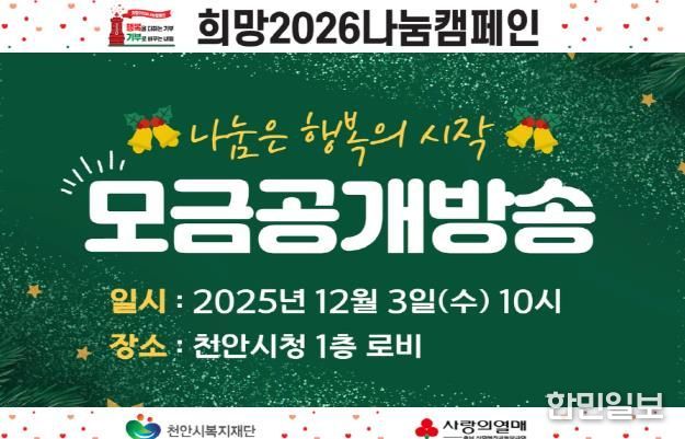 한민일보 서울포커스 황준형 기자 | (재)천안시복지재단은 내달 3일 희망2026나눔캠페인 공개모금행사 ‘나눔으로 하나되는 따뜻한 천안’을 연다고 28일 밝혔다.