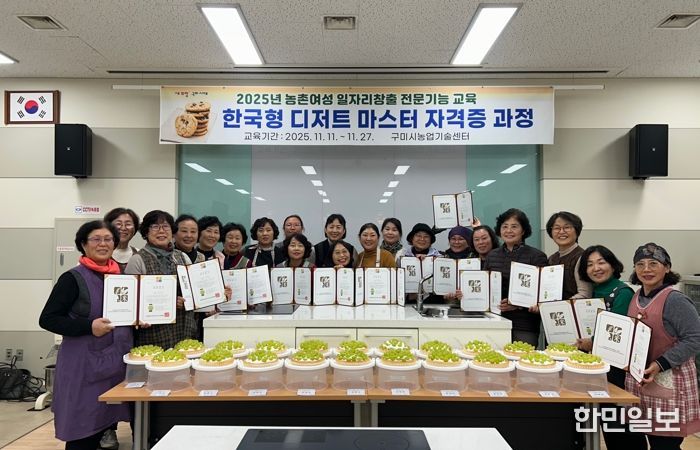 한민일보 서울포커스 김봉순 기자 | 구미시는 농촌여성의 경제활동 참여 확대와 일자리 창출을 목표로 올해 상·하반기 전문기능교육을 운영해 ‘노인실버건강지도사’와 ‘한국형 디저트 마스터’ 2개 자격증 과정을 성공적으로 마무리했다.