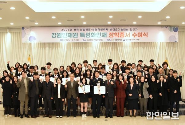 한민일보 서울포커스 곽중희 기자 | 강원인재원은 12월 1일 11시, 춘천 세종호텔 사파이어홀에서 올해 치뤄진 전국 고교생 상업경진대회·영농학생축제·바이오기술경진대회에서 입상한 강원특별자치도 특성화인재 70명에 대한 장학증서 수여식을 개최했다고 밝혔다.