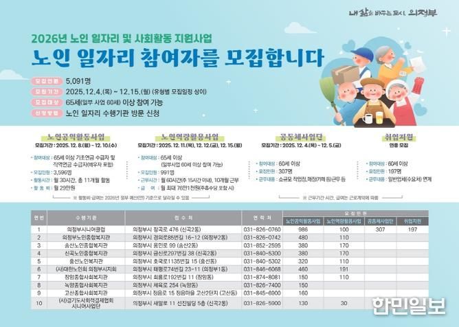 한민일보 서울포커스 심기옥 기자 | 의정부시는 12월 4일부터 15일까지 ‘2026년 노인 일자리 및 사회활동 지원사업’ 참여자 5천91명을 모집한다.