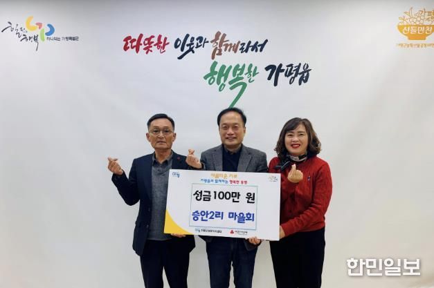 한민일보 서울포커스 최성훈 기자 | 가평군 가평읍 승안2리 마을회가 최근 가평읍 행정복지센터을 찾아 취약계층 지원을 위한 성금 1백만 원을 전달했다.