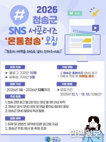 한민일보 서울포커스 김봉순 기자 | 청송군은 대한민국 대표 브랜드 ‘산소카페 청송군’의 매력을 온라인을 통해 널리 알릴 2026 청송군 SNS 홍보단 ‘온통청송’을 1일부터 12일까지 모집한다.