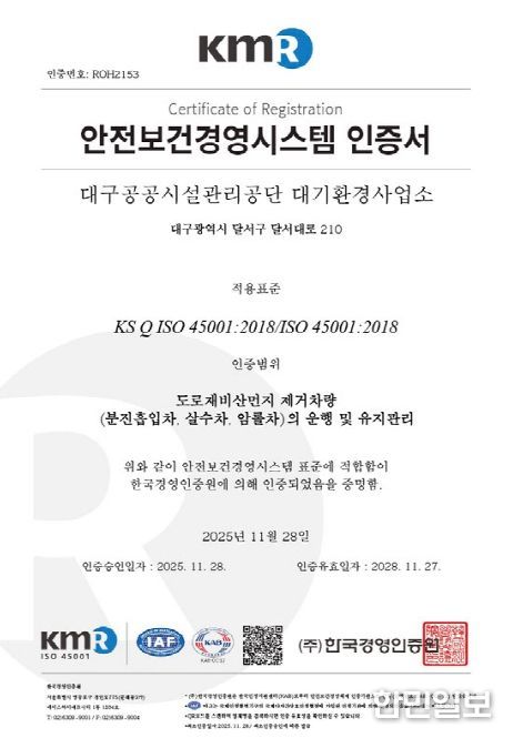 한민일보 서울포커스 김봉순 기자 | 대구공공시설관리공단 대기환경사업소는 지난 11월 28일, 한국경영인증원으로부터 안전보건경영시스템 국제 표준 ‘ISO 45001’ 인증을 획득했다고 밝혔다.