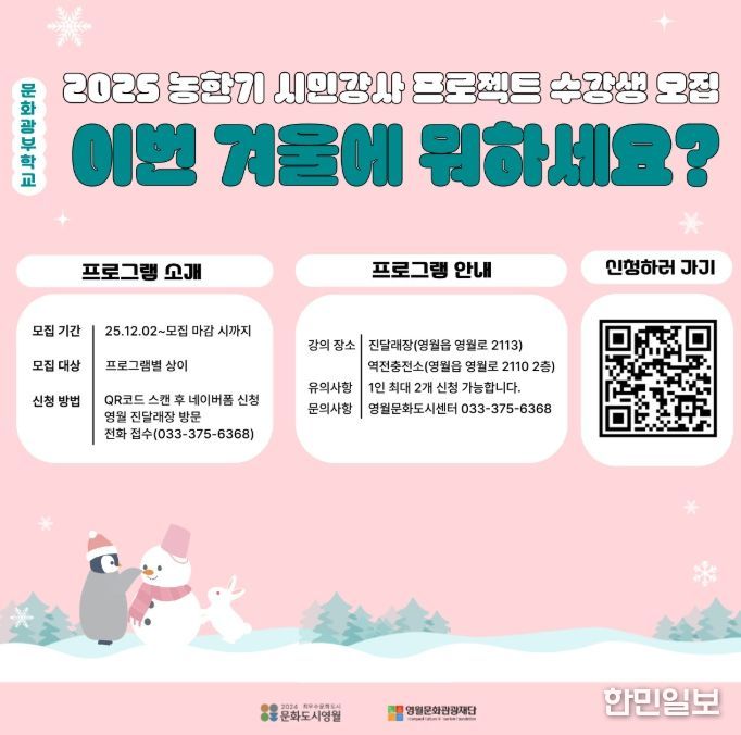 한민일보 서울포커스 진광성 기자 | (재)영월문화관광재단은 2025 문화 광부학교 농한기 시민 강사 프로젝트 수강생을 12월 2일부터 모집한다고 밝혔다.