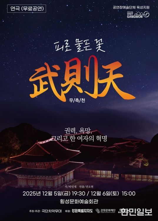 한민일보 서울포커스 진광성 기자 | (재)횡성문화관광재단과 극단 치악무대가 신작 연극 '무측천-피로 물든 꽃'을 오는 5일 저녁 7시 30분과 6일 오후 3시, 이틀간 진행한다고 밝혔다.