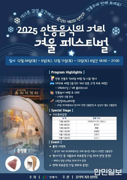 안동시 관계자는 “이번 축제는 겨울철 방문객이 줄어든 원도심에 활력을 불어넣기 위해 기획한 행사”라며 “지역의 우수한 음식과 전통주를 함께 즐길 수 있는 체험형 축제로 발전시켜, 시민과 관광객이 오래 머무는 겨울 명소로 만들어가겠다”고 전했다.