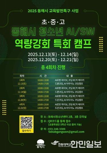 한민일보 서울포커스 임경복 기자 | 동해시는 교육발전특구 사업의 일환으로 지역 청소년들의 미래기술 역량을 강화하기 위해 한림대학교와 공동주최하는‘청소년 AI·SW 역량강화 특화 캠프(겨울)’를 운영한다.