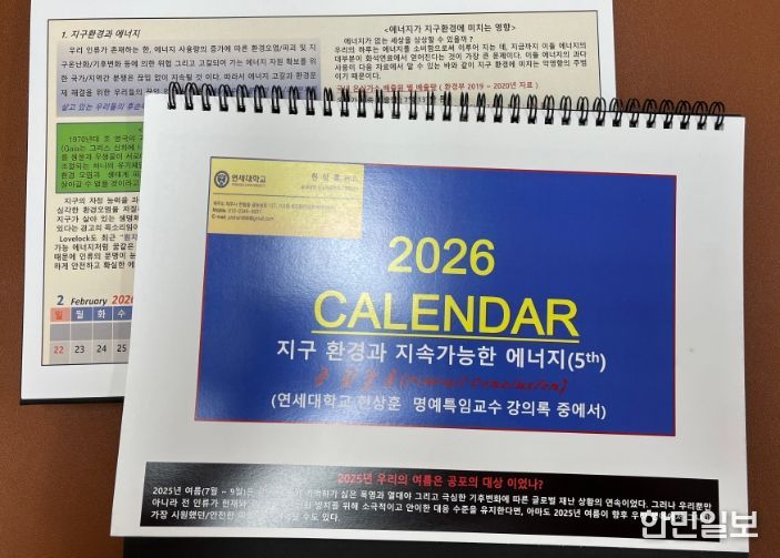 현상훈 박사는 그동안 강의해 온 지구온난화와 재생에너지, 수소·원자력 에너지, 에너지 패러다임 전환의 시급성 등 주요 환경·에너지 주제를 학생들이 보다 쉽게 이해할 수 있도록 정리해 ‘지구 환경과 지속가능한 에너지’ 달력 시리즈를 제작해왔다.