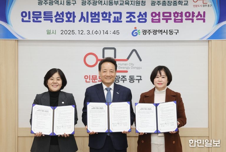 한민일보 서울포커스 박용남 기자 | 광주 동구는 2026년 새롭게 기획한 인문특성화 학교 추진을 위해 지난 3일 광주동부교육지원청, 광주충장중학교와 ‘인문 특성화 시범학교 운영을 위한 업무협약’을 체결하고 지역 인문교육 활성화를 위한 협력 기반을 구축했다고 밝혔다.