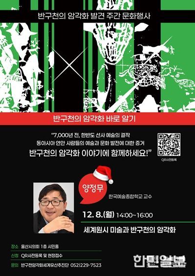 한민일보 서울포커스 임경복 기자 | 울산암각화박물관은 오는 12월 8일 오후 2시 울산시의회 1층 시민홀에서 ‘명사특강: 반구천의 암각화 바로 알기’를 개최한다고 밝혔다.