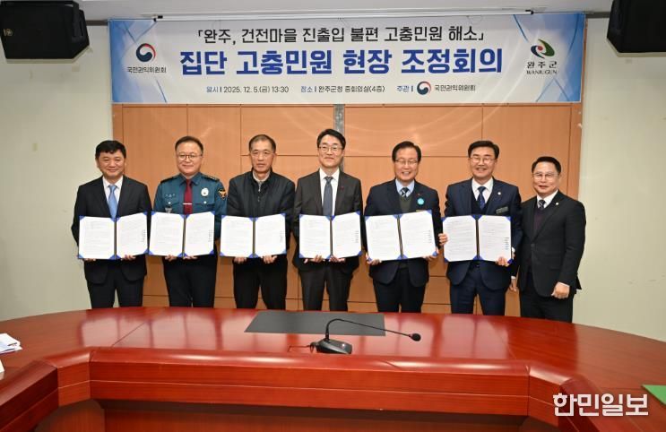 한민일보 서울포커스 박용남 기자 | 완주군의회 유의식 의장과 성중기 예산결산특별위원장은 5일 국민권익위원회, 완주군, 완주경찰서, 전주국토관리사무소, 건전마을 주민 대표와 함께 운곡교 인근 교통 불편 해소를 위한 조정안에 최종 합의하고 공식 협약을 체결했다.
