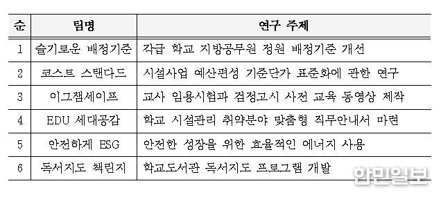 우수행정연구회로는 △각급 학교 지방공무원 정원 배정기준 개선(슬기로운 배정기준) △시설사업 예산편성 기준단가 표준화에 관한 연구(코스트 스탠다드) △교사 임용시험과 검정고시 사전 교육 동영상 제작(이그잼세이프) △학교 시설관리 취약분야 맞춤형 직무안내서 마련(EDU 세대공감) △안전한 성장을 위한 효율적인 에너지 사용(안전하게 ESG) △학교도서관 독서지도 프로그램 개발(독서지도 책린지) 등 6팀이 선정됐다.