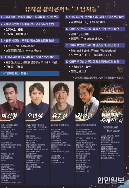 한민일보 서울포커스 김봉순 기자 | 문경문화예술회관에서는 연말을 맞아 뮤지컬 배우 유준상, 오만석, 박건형이 출연하는 뮤지컬 갈라콘서트 ‘그 남자들’ 공연을 12월 23일 19:30, 24일 19:30 (2일 2회)에 문경문화예술회관 대공연장에서 개최한다.