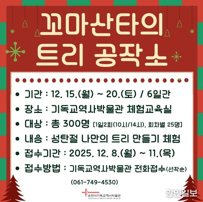 한민일보 서울포커스 임광현 기자 | 순천시는 다가오는 성탄절을 맞아 기독교역사박물관에서 어린이와 가족이 함께 참여하는 체험 프로그램 ‘꼬마산타의 트리 공작소’를 오는 15일부터 20일까지 운영한다고 밝혔다.