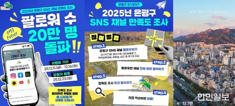 한민일보 서울포커스 임광현 기자 | 서울 은평구는 구 공식 사회관계망서비스(SNS) 누적 팔로워가 20만 명을 돌파함에 따라, 주민 소통 강화를 위해 개설 이후 처음으로 만족도 조사를 시행한다고 밝혔다.