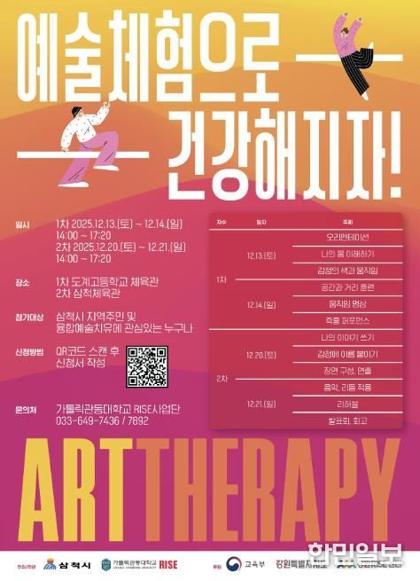한민일보 서울포커스 임경복 기자 | 삼척시는 가톨릭관동대학교 RISE 사업단과 협력하여 지역 자연자원을 활용한 ‘융합예술치유 프로그램’을 오는 12월 도계고등학교 체육관과 삼척체육관에서 개최한다.