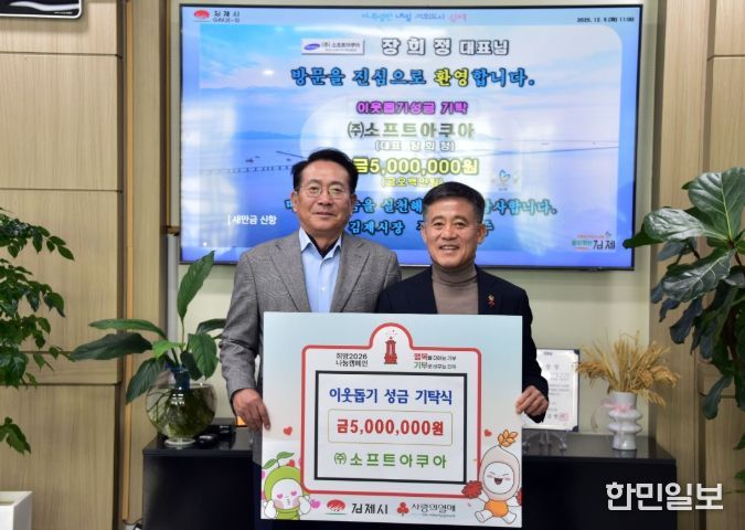 한민일보 서울포커스 박용남 기자 | 김제시는 (주)소프트아쿠아(대표 장희정)가 지난 9일 관내 취약계층을 돕기 위한 성금 500만원을 기탁했다고 밝혔다.