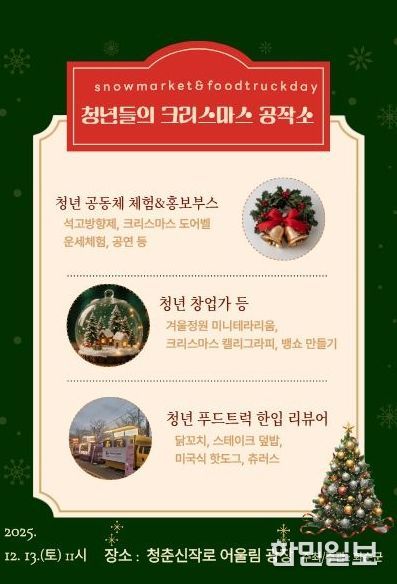조미화 인구청년정책과장은 "서로 다른 분야에서 활동하는 청년들이 교류하고, 군민들과 함께 연말의 따뜻한 추억을 쌓을 수 있는 자리"라며, “많은 분이 방문해 청년들의 열정을 응원해 주시길 바란다”라고 전했다.