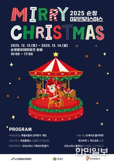 한민일보 서울포커스 김용택 기자 | (재)순창발효관광재단(이사장 최영일 순창군수)은 오는 13일부터 14일까지 이틀간, 순창발효테마파크에서 ‘2025 순창 미리 크리스마스’ 겨울 축제를 개최한다고 밝혔다.