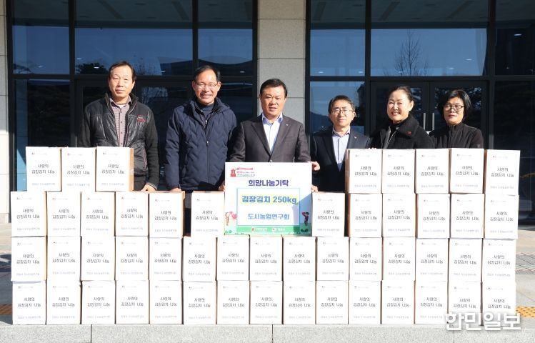 시는 12일 도시농업연구회가 직접 재배한 배추와 무로 담근 김치 5kg 50상자(190만원 상당)를 기탁하며 온정을 나눴다고 밝혔다.