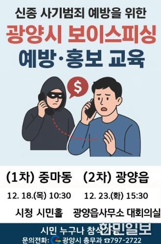 한민일보 서울포커스 임광현 기자 | 광양시는 최근 중앙부처·지자체 공무원 사칭 범죄가 전국적으로 증가하고 쿠팡 개인정보 대규모 유출 등 시민 불안이 확산됨에 따라, 신종 보이스피싱 사기범죄 예방을 위해 전 시민을 대상으로 보이스피싱 예방·홍보 교육을 실시한다고 밝혔다.
