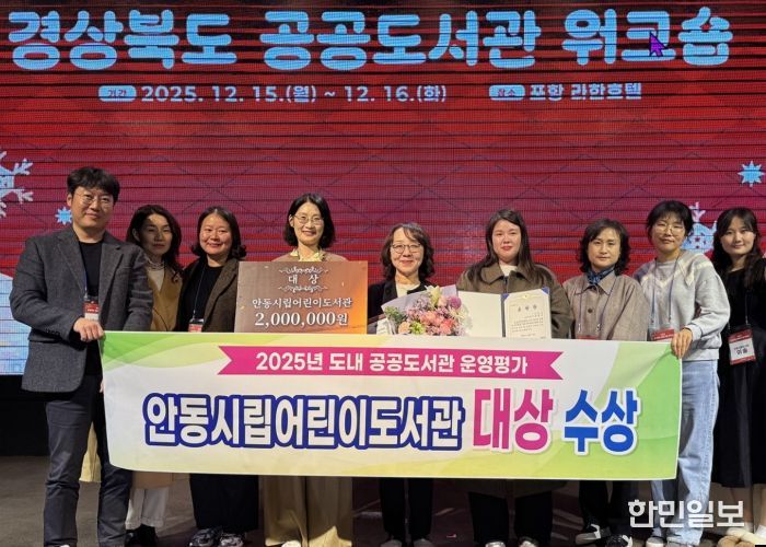 한민일보 서울포커스 김봉순 기자 | 안동시립어린이도서관이 ‘2025년 경상북도 공공도서관 운영 평가’에서 대상으로 선정돼, 12월 15일(월) 포항 라한호텔에서 열린 ‘경상북도 공공도서관 워크숍’에서 도지사 표창을 받았다.