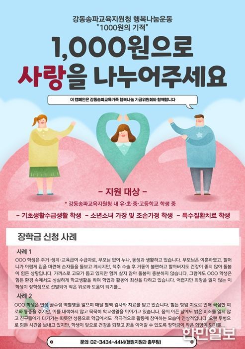 한민일보 서울포커스 국용호 기자 | 서울특별시교육청 산하 강동송파교육지원청은 관내 학교 및 지원청 교직원들의 자발적인 기부로 조성된 ‘강동송파교육가족 행복나눔운동 '천원의 기적'’을 통해 2025년 취약계층 및 특수질환 학생을 지원한다.