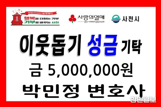 한민일보 서울포커스 김은금 기자 | 박민정 사천시 고문변호사는 지난 15일 사천시청을 방문해 관내 공동생활가정 까치둥지(200만 원), 모모네(150만 원), 호산나 그룹홈(150만 원)에 성금 500만 원을 기탁했다.