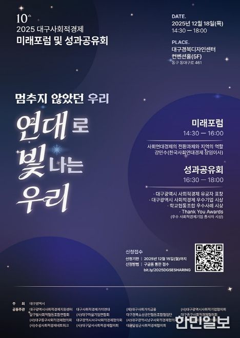 한민일보 서울포커스 김봉순 기자 | 대구광역시와 대구사회적경제지원센터는 12월 18일 오후 2시 30분, 대구경북디자인센터 컨벤션홀에서 지역 사회적경제 기업인 및 유관 단체 관계자 등 120여 명이 참석한 가운데 ‘2025 대구 사회적경제 미래포럼 및 성과공유회’를 개최했다.