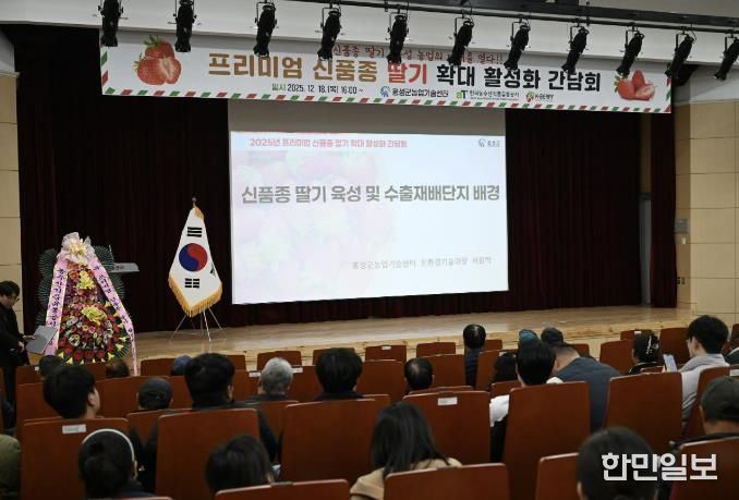 군에 따르면 지난 18일 홍성군농업기술센터 대강당에서 ‘국내·외 딸기산업 경쟁력 강화를 위한 프리미엄 신품종 딸기 확대 활성화 간담회’를 성황리에 개최했다. 이날 행사에는 유관기관 관계자와 수출업체, 유통 전문 벤더, 딸기농업인 등 150여 명이 참석해 홍성 신품종 딸기의 육성 성과와 수출 확대 방안을 공유했다.