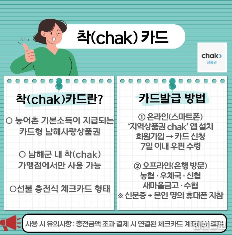 한민일보 서울포커스 김서윤 기자 | 남해군은 농어촌 기본소득 시범사업의 본격적인 시행에 앞서, 지급 수단인 카드형*(chak) 지역사랑상품권의 사전 발급이 필요하다고 밝혔다.