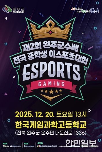 완주군은 오는 12월 20일, 한국게임과학고등학교에서 '제2회 완주군수배 전국 중학생 e스포츠대회'를 개최한다고 밝혔다.
