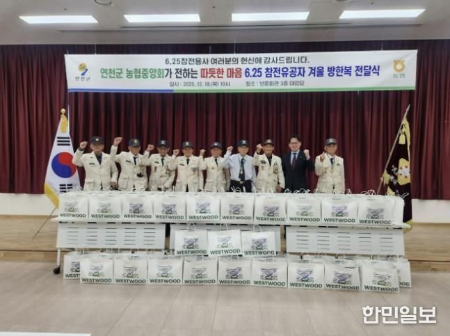 한민일보 서울포커스 임경복 기자 | NH농협 연천군지부는 18일 연천군 보훈회관에서 연천 관내 6.25 참전유공자에 감사와 사랑의 마음을 담은 600만원 상당의 위문품(동절기 방한복)을 전달했다.