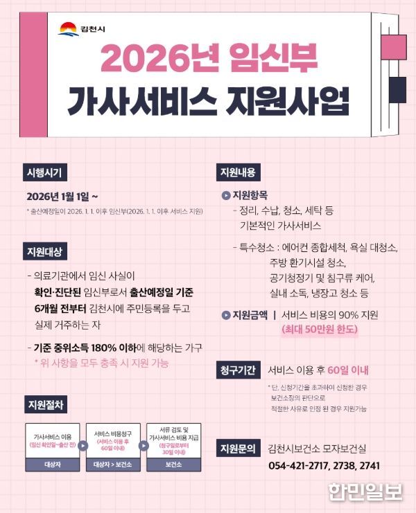 한민일보 서울포커스 최성훈 기자 | 김천시는 2026년 1월 1일부터 경상북도 내에서 처음으로 ‘임신부 가사서비스 지원사업’을 본격 시행한다.