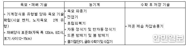 한편, 농촌진흥청은 농촌 인구 감소와 고령화로 일손 구하기가 힘든 현장의 어려움을 해결하고자 기계 개발 연구에 재배 기술, 저장 등 다른 기술을 연계한 밭작물 전 과정 기계화를 추진하고 있다.