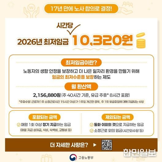2026년 시간당 최저임금 10,320원