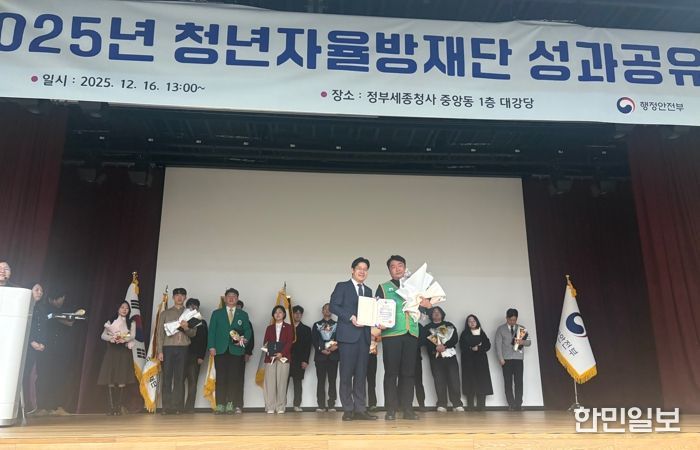한민일보 서울포커스 김은금 기자 | 사천시 자율방재단장 박덕만과 청년자율방재단장 강정일은 지난 12월 16일, 행정안전부가 주최한 '2025년 청년자율방재단 성과공유회 및 장관표창 수여식'에 참석해 청년 재난안전 활동의 성과를 공유하고 우수 사례를 확산하는 뜻깊은 시간을 가졌다.