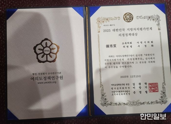 한민일보 서울포커스 김은금 기자 | 사천시의회 구정화 의원이 12월 19일, 국회의사당에서 열린 여의도정책연구원 주최 ‘2025 지방자치평가 의정정책 우수상’을 수상했다.