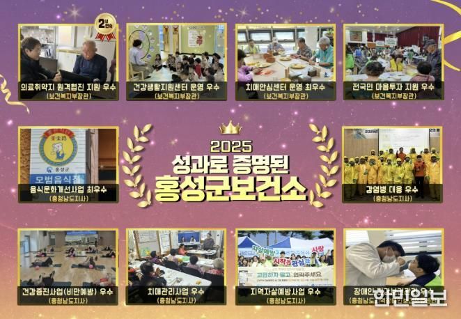 홍성군보건소는 2025년 중앙부처와 충청남도가 주관한 11개 분야 평가에서 우수기관에 선정되며 사업 기획력과 실행력을 동시에 인정받았다. 주요 수상내역으로는 ▲의료취약지 원격협진 지원사업 2년 연속 우수기관(보건복지부) ▲건강생활지원센터 운영 우수기관(보건복지부) ▲치매안심센터 운영 최우수기관(보건복지부) ▲치매관리사업 우수사례 공모전 맞춤형 사례관리 부문 우수상(보건복지부) ▲전국민 마음투자 지원사업 우수기관(보건복지부) ▲음식문화개선사업 평가 최우수기관(충청남도) ▲감염병 대응 우수기관(충청남도) ▲건강증진사업(비만예방) 우수기관(충청남도) ▲치매관리사업 우수기관(충청남도) ▲지역자살예방사업 우수기관(충청남도) ▲장애인 건강보건관리 우수기관(충청남도지역장애인보건의료센터)이 포함됐다.