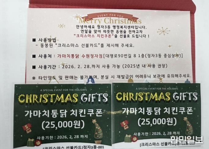 이번 나눔은 정자3동 주민자치 프로그램 강사가 이웃사랑 실천을 위해 기부한 성금 100만 원과 가마치통닭 수원정자점의 후원으로 마련됐으며 크리스마스를 앞두고 가족과 함께 따뜻한 시간을 보낼 수 있도록 치킨쿠폰을 준비하여 대상 가구에 배부됐다.