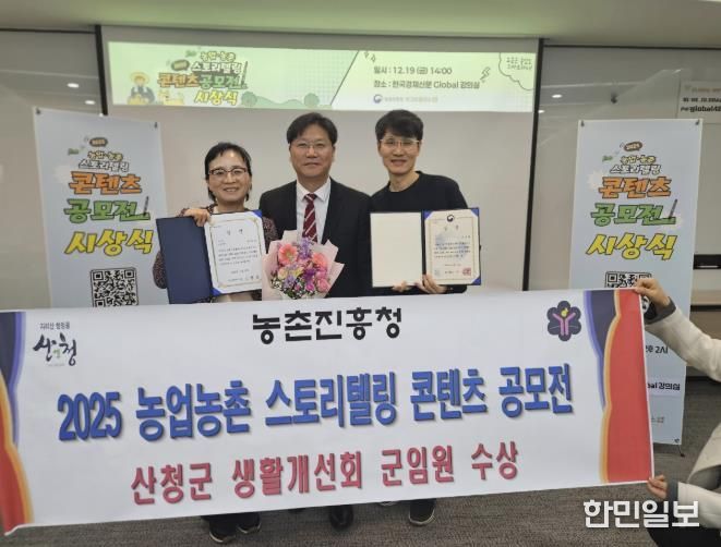 한민일보 서울포커스 김은금 기자 | 산청군은 산청군 생활개선회 박영순 부회장이 지난 19일, 농촌진흥청과 ㈜아그로플러스가 공동 주최한 ‘2025 농업‧농촌 스토리텔링 콘텐츠 공모전’에서 작품 '떨어져 사는 게 아니라 함께 사는 삶'으로 장려상을 수상했다고 22일 밝혔다.