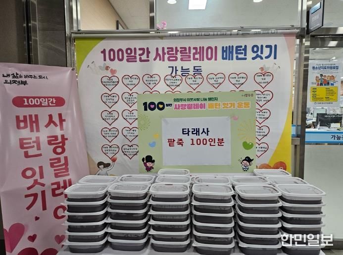 한민일보 서울포커스 심기옥 기자 | 의정부시 가능동주민센터는 12월 19일 한국불교태고종 타래사가 동지를 맞아 팥죽 100그릇을 기탁하며 ‘100일간 사랑릴레이 배턴 잇기’에 동참했다고 밝혔다.