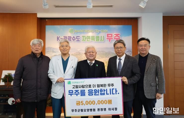 한민일보 서울포커스 박용남 기자 | 무주군으로부터 무주군립요양병원을 위탁받아 운영하는 (사)소산 권창영 이사장이 고향사랑기부금 5백만 원을 기탁했다. 이날 기탁식에는 권도훈 무주군립요양병원장과 임원진 등 4명이 함께 해 의미를 더했다.