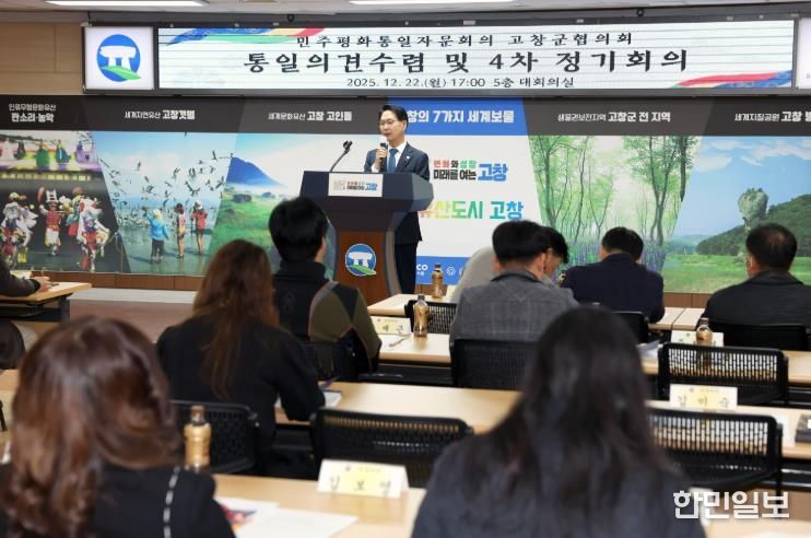 한민일보 서울포커스 박용남 기자 | 민주평화통일자문회의 고창군협의회가 지난 22일 오후 고창군청 5층 대회의실에서 대행 기관장인 고창군수, 자문위원 50여 명이 참석한 가운데 ‘화해·협력의 남북 관계 재정립을 위한 정책방향’을 주제로 2025년 4차 정기회의를 개최했다.