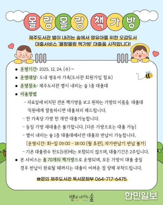 한민일보 서울포커스 임경복 기자 | 제주도교육청 제주도서관은 24일부터 영유아 오감도서 대출 서비스 ‘몰랑몰랑 책가방’을 운영한다.
