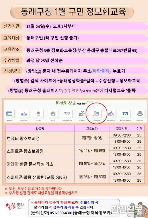 한민일보 서울포커스 임광현 기자 | 부산 동래구는 2026년 1월부터 구민의 디지털 역량 강화를 위한 정보화 교육 프로그램을 동래구청 3층 정보화교육장에서 운영한다고 밝혔다.