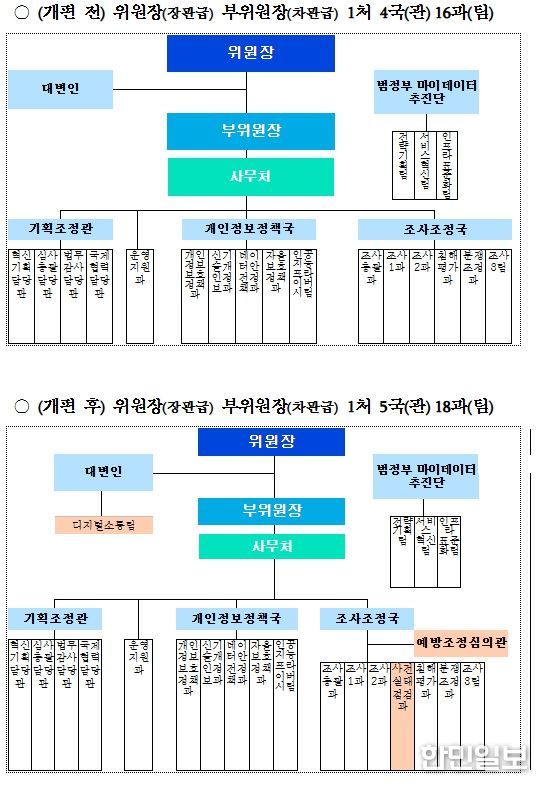 개인정보위는 선제적 위험 식별과 예방 점검 기능을 전담하는 예방조정심의관(고위공무원 나급), 사전실태점검과(7명)를 신설한다.