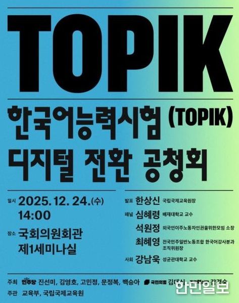 한민일보 서울포커스 임경복 기자 | 교육부, 국립국제교육원(원장 한상신)은 12월 24일 오후 2시, 국회의원회관 제1세미나실에서 여·야 의원실 공동주최로 ‘한국어능력시험(TOPIK) 디지털 전환 공청회’를 개최하고, ‘한국어능력시험 디지털 전환 기본 계획 수정 시안’에 대한 의견을 청취한다고 밝혔다.