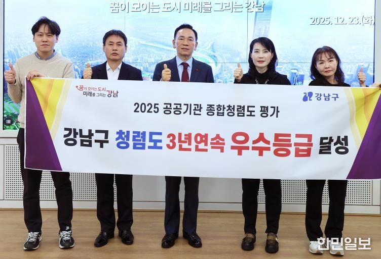 조성명 강남구청장은 “3년 연속 종합청렴도 우수등급은 청렴이 행정 신뢰를 높이고 도시 경쟁력을 키우는 핵심 자산임을 보여준 결과”라며 “앞으로도 예산 집행과 사업 추진 전 과정의 투명성을 강화해 구민 신뢰를 더 굳히고 ‘구민과 함께하는 청렴한 강남’을 만들어가겠다”고 밝혔다.